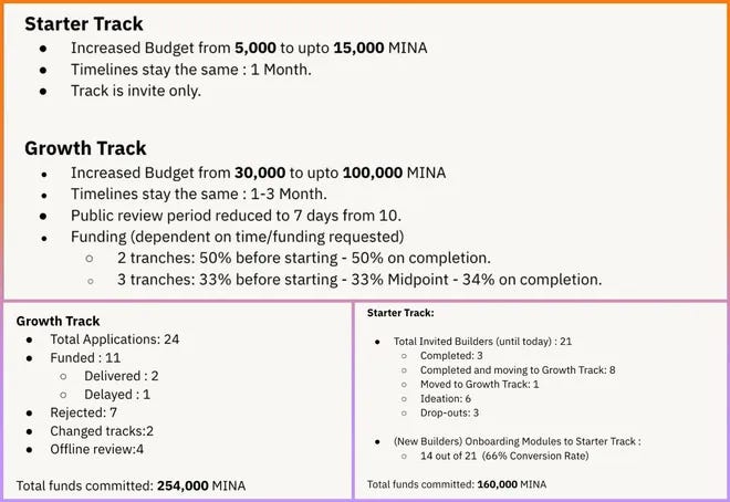 The Mina Navigators Program has increased Starter Track grant amounts from 5,000 to 15,000 and Growth Track grant amounts from 30,000 to up to 100,000, providing enhanced support for Mina Protocol builders.