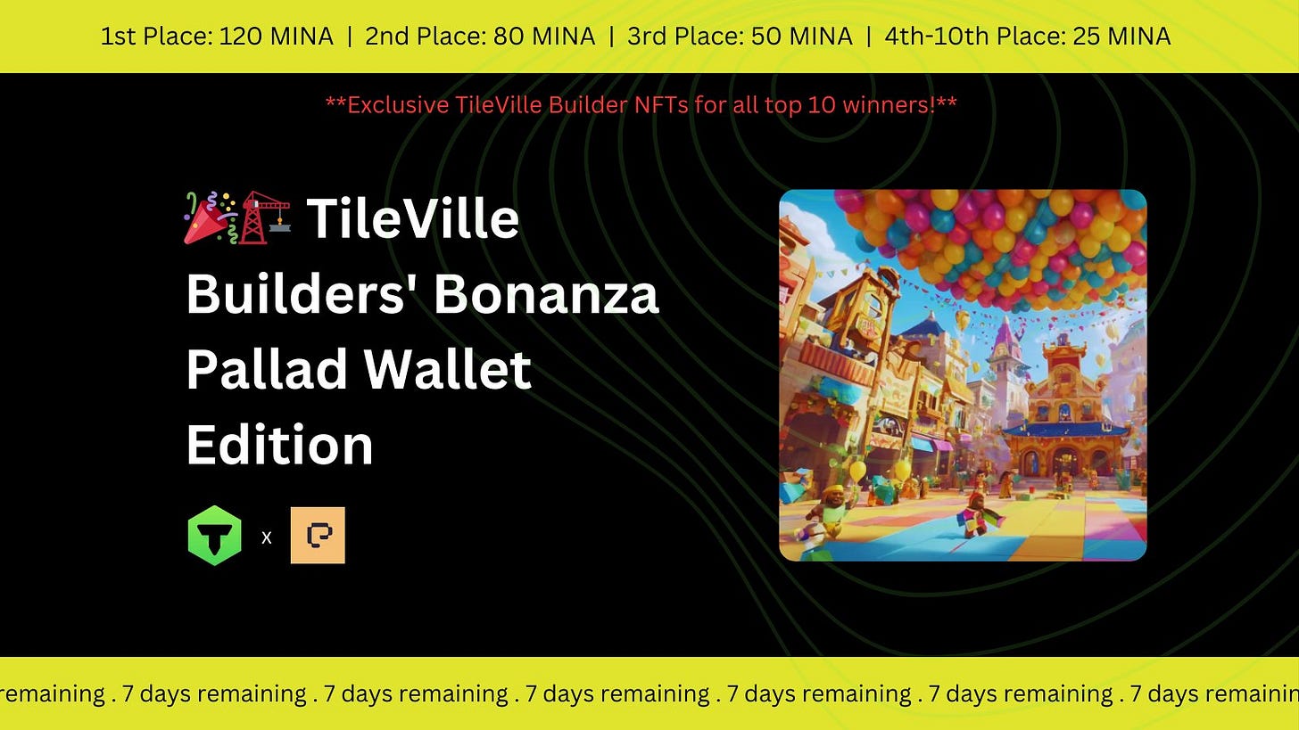 To commemorate the Pallad Wallet integration, TileVille has introduced a competition with exciting prizes, including exclusive TileVille Builder NFTs and a share of 450 MINA tokens. Pallad has since increased the prize pool by 200 MINA, bringing the total to 650 MINA. All details could be found here.