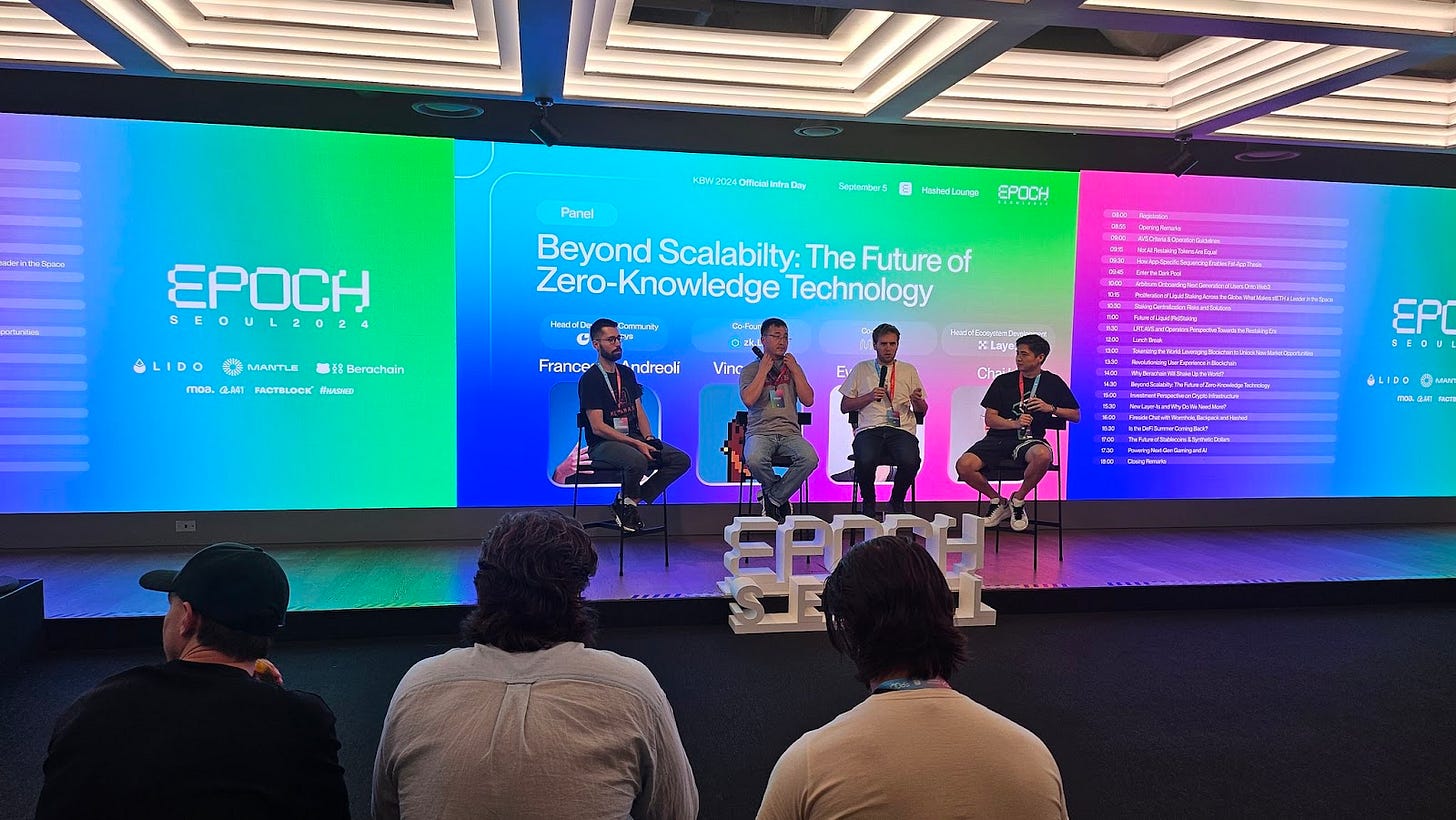Evan Shapiro, co-founder of Mina Protocol, participated in a panel discussion at the Hashed lounge during Epoch Seoul 2024. The panel, titled Beyond Scalability: The Future of Zero-Knowledge Technology, featured insights from Consensys and zkLink, exploring the evolving role of ZKPs in blockchain scalability and privacy.