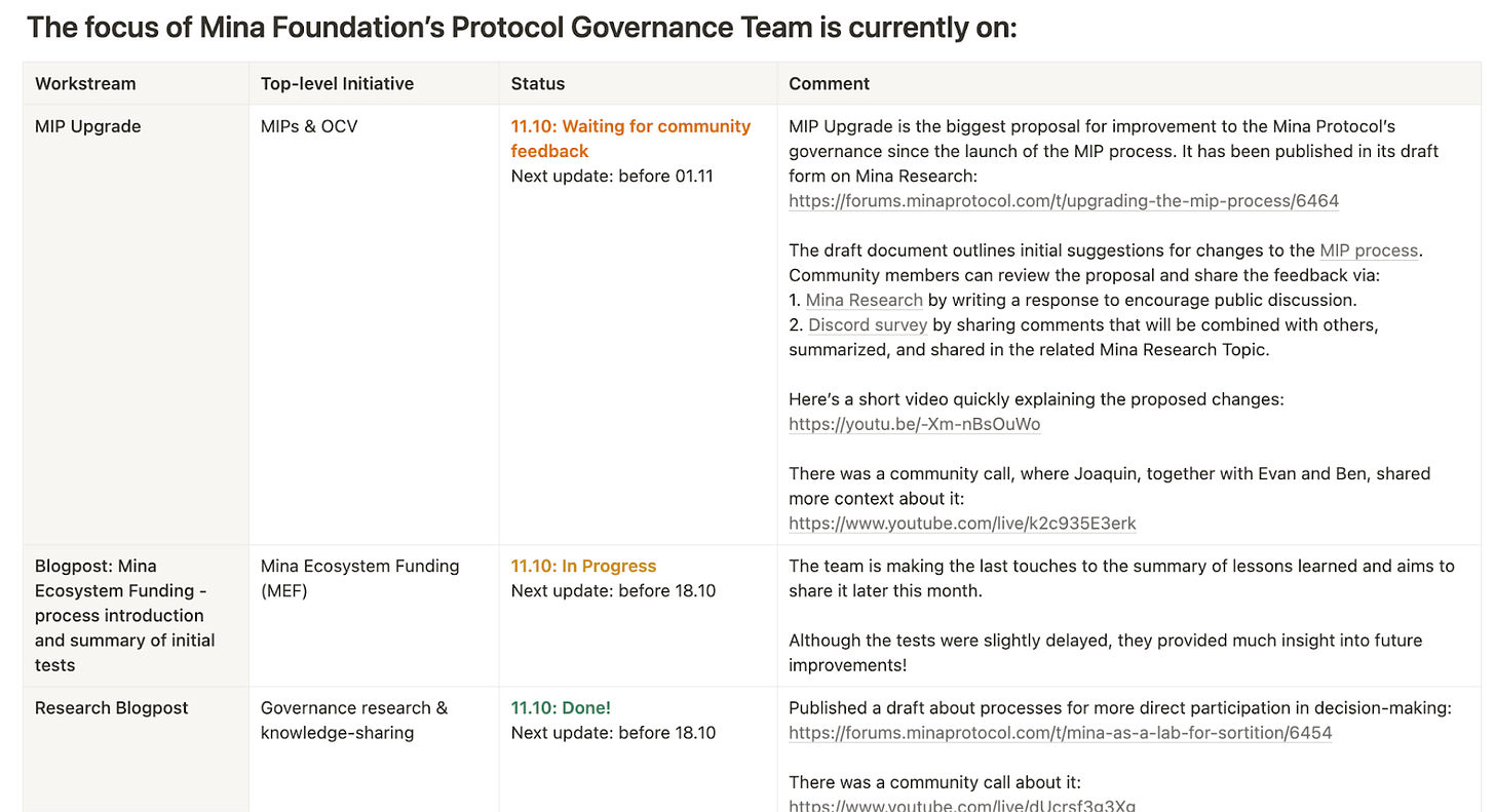 MIP Upgrade: Community feedback is being gathered on proposed improvements to the governance process. You can find the draft proposal and more details on Mina Research.