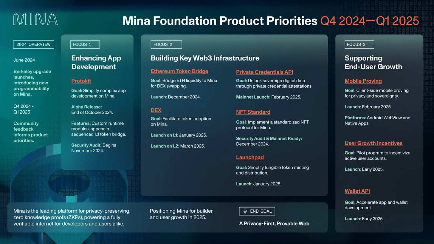 The Mina Foundation has outlined its key product priorities for the next six months following the successful Berkeley upgrade. These priorities include enhancing app development with Protokit, building key infrastructure like an Ethereum token bridge and DEX, and supporting end-user growth through mobile proving and wallet APIs. These initiatives aim to position Mina as a leading ZK platform for developers while driving user adoption.