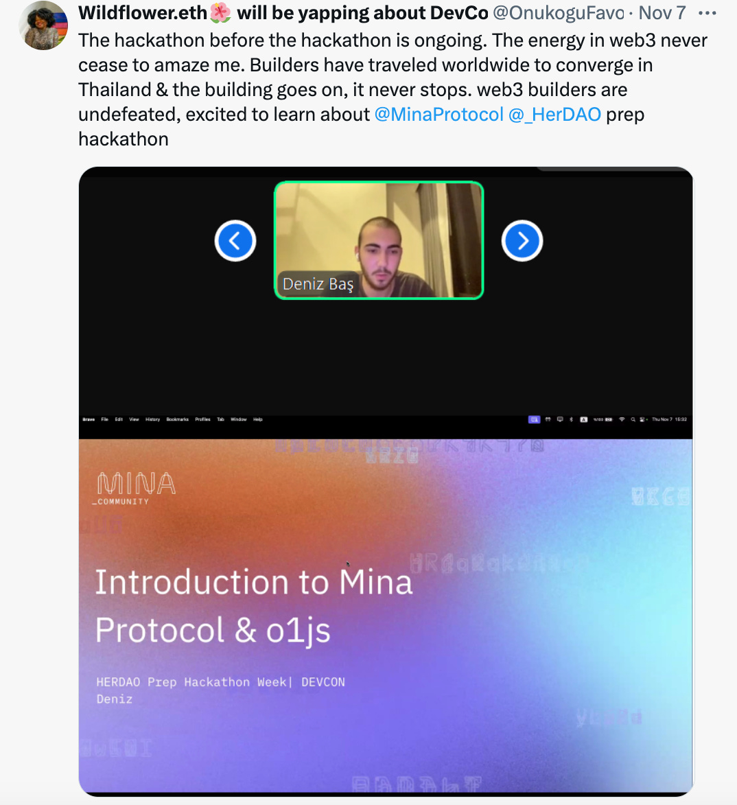 As part of HerDAO’s Prep Hackathon Week, Deniz Baş from Mina Protocol presented an "Introduction to Mina Protocol & o1js," showcasing Mina's lightweight blockchain and development tools to inspire the next generation of web3 innovations. This prep week focuses on skill-building, offering participants the tools and time needed to create high-quality projects.