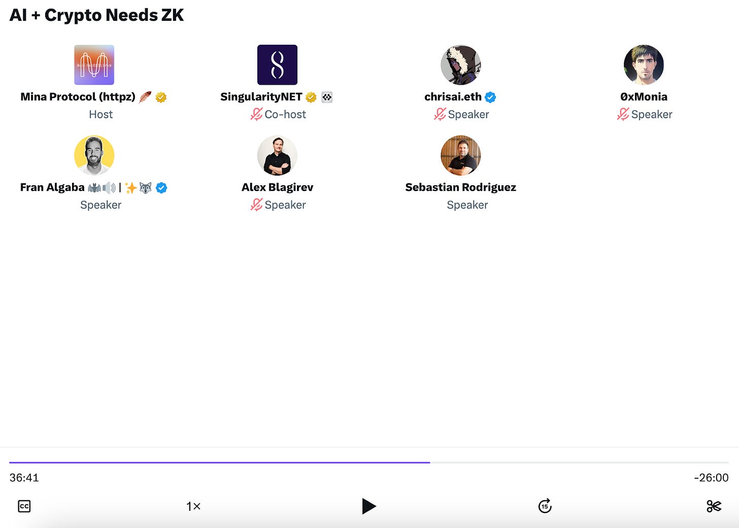 Mina Protocol recently hosted a Twitter Space titled "AI + Crypto Needs ZK", where experts including SingularityNET, Fran Alga, Alex Blagirev, Sebastian Roa, chrisai.etl, and 0xMonia shared their insights on the intersection of AI, blockchain, and zero-knowledge technology.
