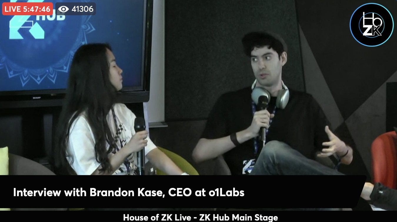 Brandon Kase, CEO of o1Labs, joined ProjectZKM’s Alice Liu for a live interview on the ZK Hub Main Stage. The session, hosted by House of ZK, attracted over 40,000 viewers and delved into insights on zero-knowledge technology and its future.