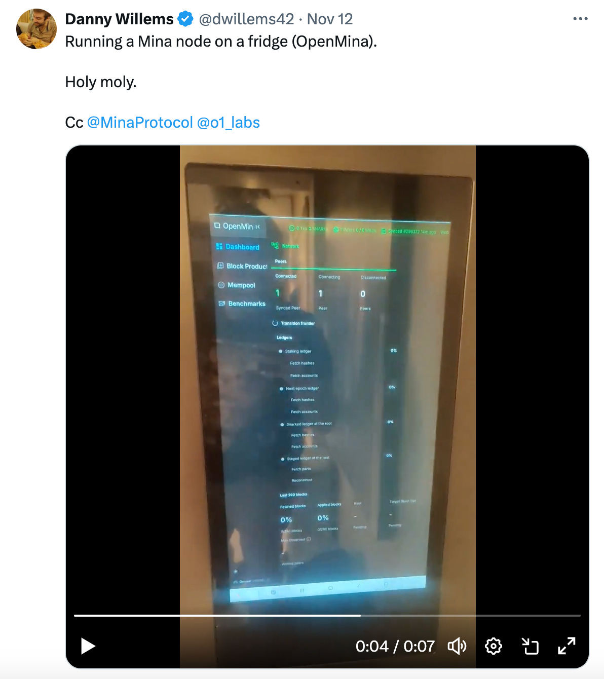 Mina's lightweight blockchain is demonstrating its adaptability with creative setups powered by OpenMina. Community members have showcased Mina block producer nodes running on unconventional devices like a smart fridge and a Tesla. These examples highlight the minimal hardware requirements and flexibility of Mina's architecture, made possible through OpenMina, which brings decentralized capabilities to everyday devices.