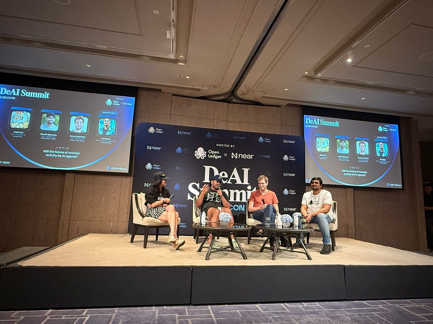 Evan Shapiro, Chairman of the Board at Mina Foundation, participated in a panel discussion at the DeAI Summit during DevCon. The session, titled "Will the Future of On-Chain Activity Be AI Agents?", explored the synergy between AI agents and blockchain, featuring insights from leaders at Movement Labs, MegaETH Labs, and other prominent contributors.