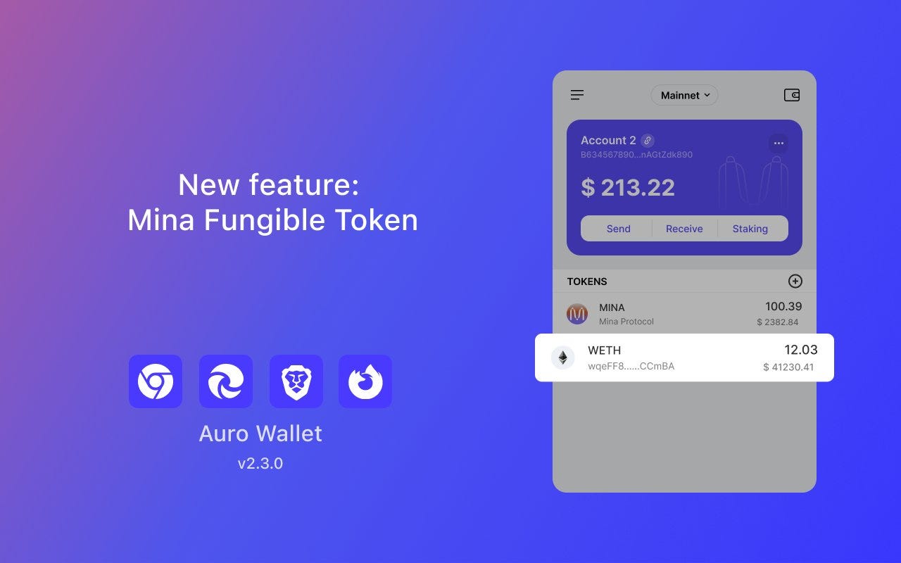 Auro Wallet v2.3.0 added support for Mina fungible and custom tokens, enabling users to view balances, send/receive tokens, and track transaction history in one interface. Audited by @osec_io, this update enhanced the wallet’s zkApp functionality and streamlined digital asset management.